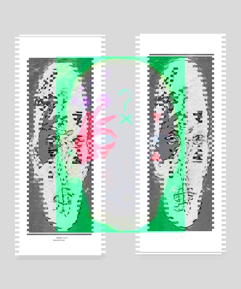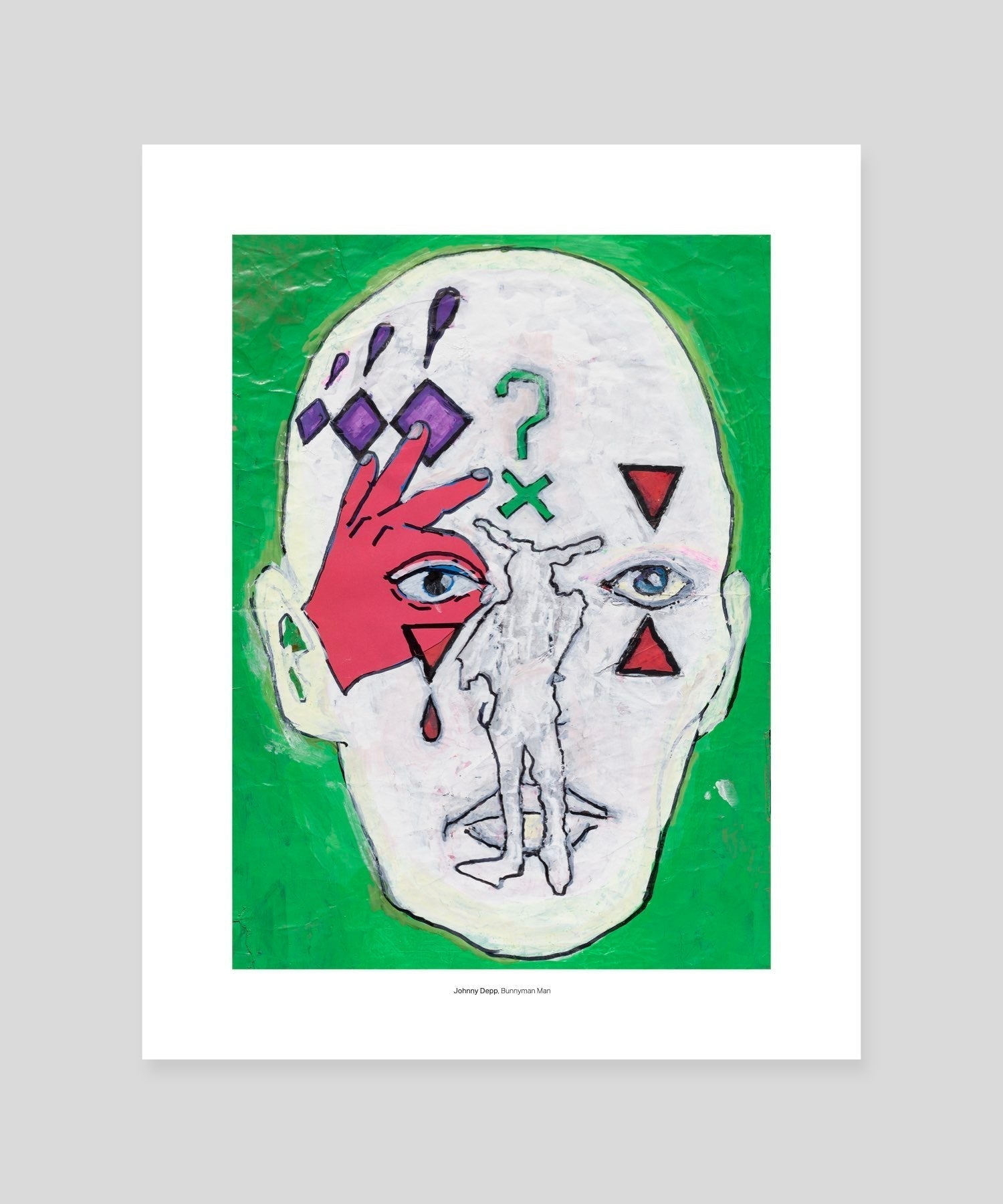 ジョニーの作品『Bunnyman Man』のミニプリント。この作品には、彼の象徴的なクエスチョンマークや「The Everyman」など、代表的なモチーフが描かれています。